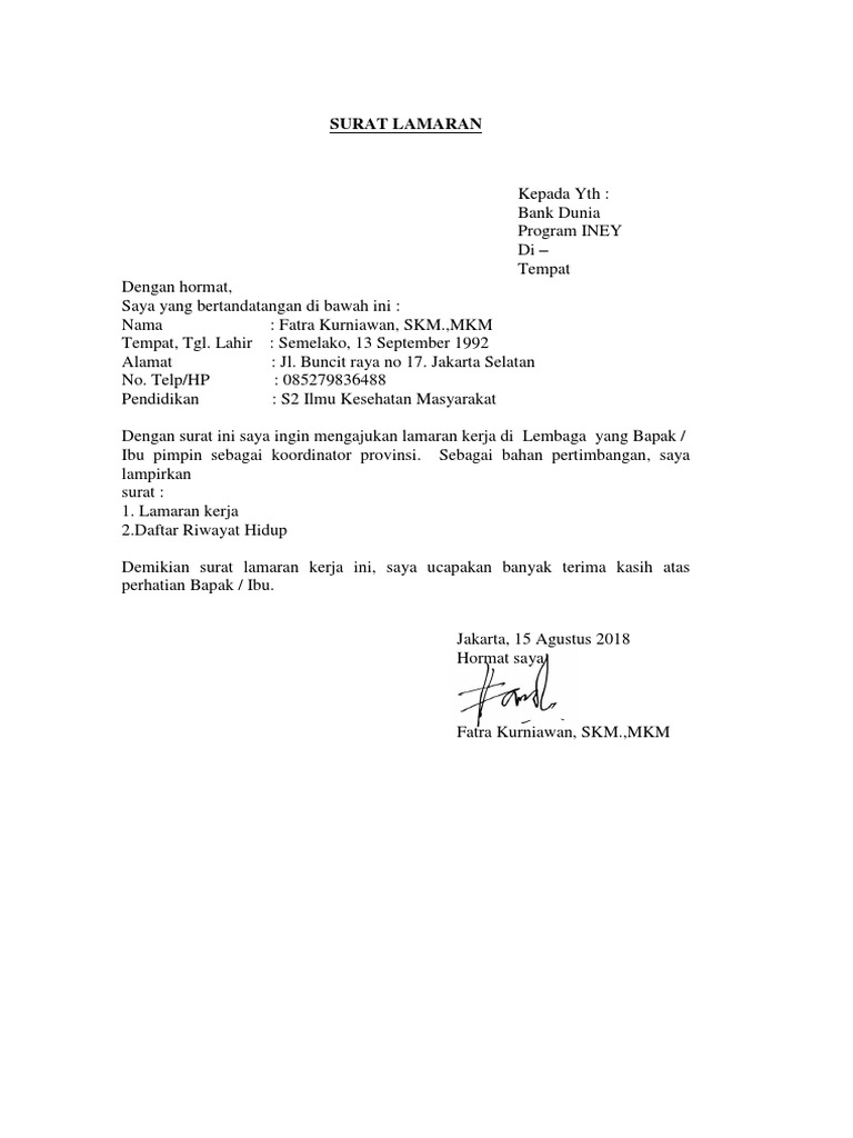Surat lamaran kerja merupakan poin penting yang menentukan apakah anda diterima kerja pada tempat umumnya cara menulis surat lamaran kerja untuk diajukan kemanapun sama saja isinya. Penghasilan berupa uang bisa didapatkan dengan cara bekerja dan berbisnis. Contoh cara mengirim surat lamaran kerja online via email semakin berkembangnya teknologi, semakin mudah kita untuk melakukan suatu pekerjaan, salah satunya. Fatra kurniawan, skm.,mkm tempat, tgl. Surat lamaran juga bisa menunjukkan karakter dan kualitas seseorang.